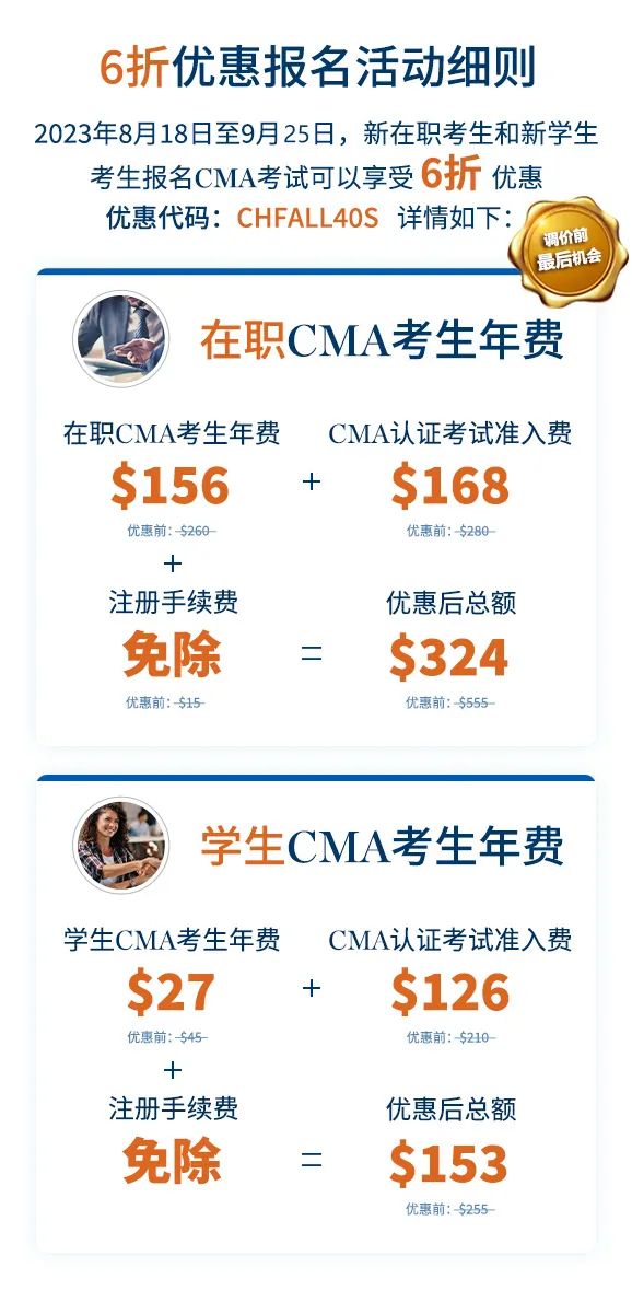 为帮助财务专业人士学习管理会计知识,提升职场竞争力和拓展职业人脉。本次“从优秀到卓越,只有一个CMA认证的距离”的6折优惠活动的截止日期将延期至9月25日。