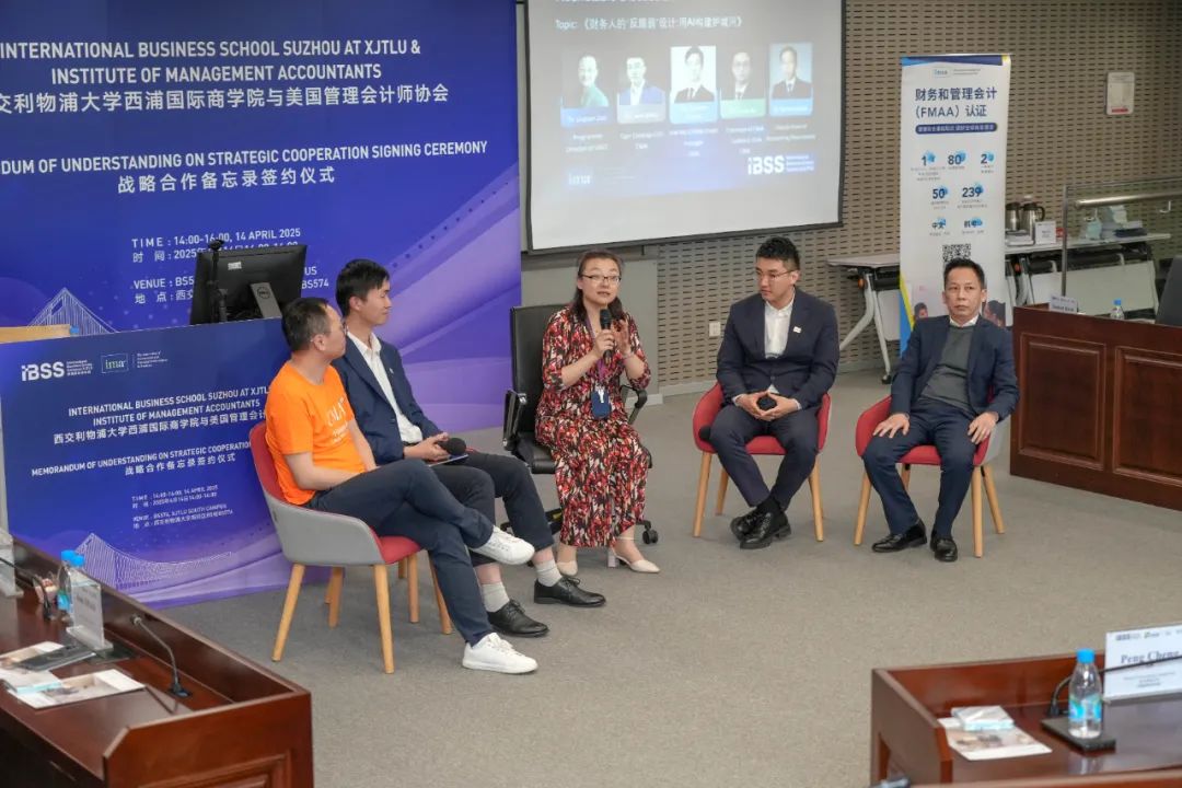 签约仪式当日,一场聚焦“AI赋能管理会计职业发展”的思想盛宴同步启幕。IMA特邀三位具有行业标杆意义的CMA持证者走进西浦商学院讲堂,通过主题演讲与圆桌对话,为现场师生以及嘉宾解码数智化浪潮下的财务人才进阶密码。老虎表面技术新材料(苏州)有限公司首席财务官赵士豪先生为与会者剖析了《AI时代下,企业眼中的财务人才》。CMA苏州精英俱乐部主席许秋迪先生带来了题为《以终为始:管理会计在职业跃迁中的三级跳》的主旨演讲。圆桌交流期间,西浦商学院会计学本科项目专业负责人左凌燕博士担任主持,与西浦商学院会计系副主任郭剑光教授、喜利得(中国)商贸有限公司信用经理张佳凯先生(CMA)与两位主讲嘉宾,共同围绕《财务人的“反脆弱”设计:用AI构建护城河》的主题,探讨复合型管理会计人才在当前经济环境下的重要性。