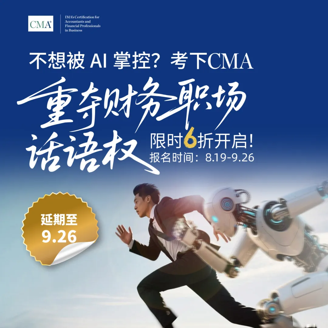 为助力财务专业人士深入学习管理会计,提升职场竞争力并拓展优质人脉,IMA协会特别推出限时福利“不想被AI掌控?考下CMA,重夺财务职场话语权!”活动仅剩最后2,000个名额,截止日期延长至9月26日。新在职及新学生考生可享准入费与考生年费6折优惠,补考考试费7折优惠(新老考生不限,规则见下图)。名额有限,报满即止,请尽快报名,切勿错过最后机会!