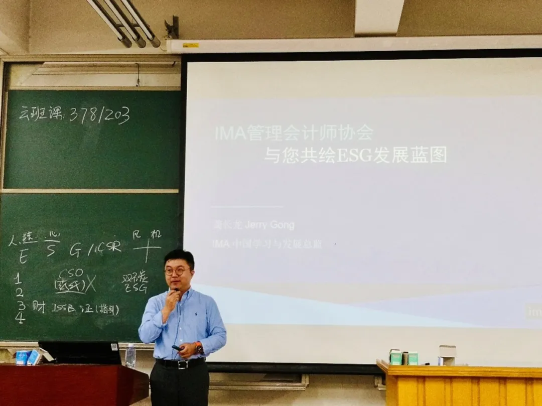 龚长龙先生则分别从全球人才需求视角,向同学们介绍了IMA最新发布的《IMA管理会计能力素质框架拓展版(2025版)》。他指出,在数字化与绿色转型双轮驱动下,从业人员需具备数据分析、可持续治理、战略决策等复合能力,鼓励学生“主动拥抱变化,通过持续学习抢占ESG人才赛道先机”。另外,他也介绍了《IMA可持续发展商业实践证书课程》,以及如何通过该课程更好地助力专业人士在ESG领域的发展。