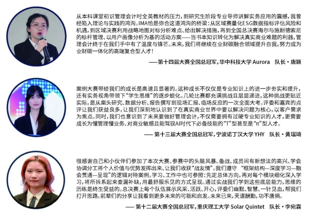 IMA校园管理会计案例大赛自2009年首次向中国高校开放以来, 已在中国成功举办十四届,获得众多企业和高校的认可与支持,累积吸引近千所高校30,000余名学生报名参赛,超过200多万人次关注。众多参赛者在大赛中脱颖而出,赢得了名企实习及就业机会,开启了职业生涯的新篇章。