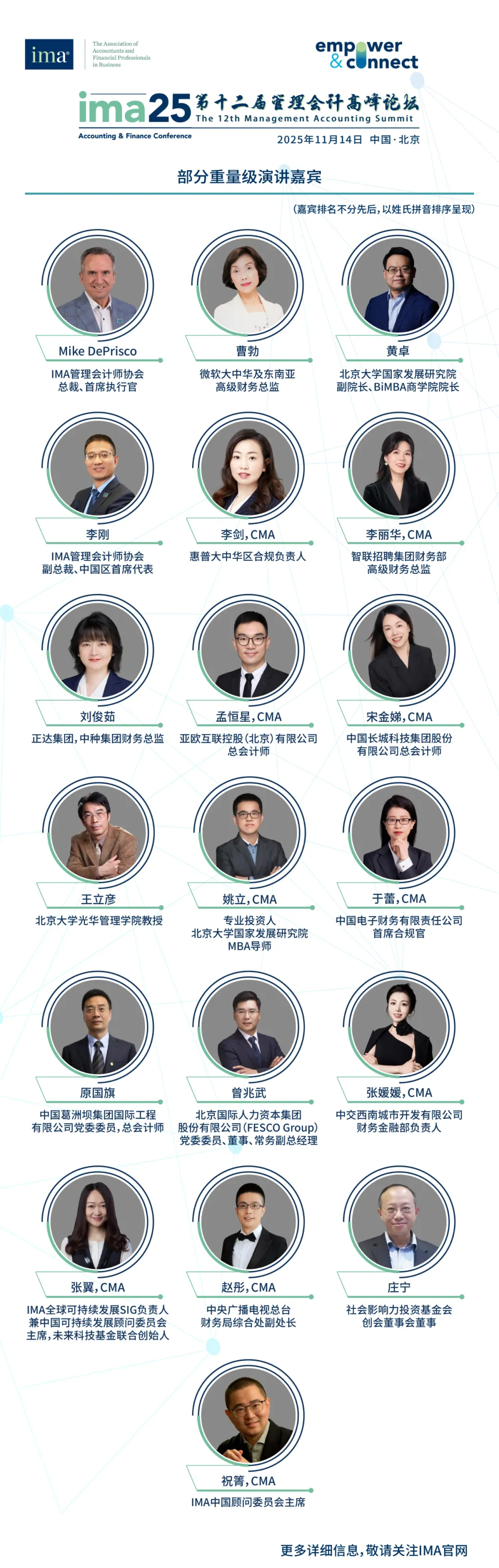 为助推管理会计前沿领域的研究和实施落地,全方位助力加速推进财务转型升级与治理现代化能力提升,推动管理会计在中国本土化应用与国际标准的融合发展,由IMA 管理会计师协会主办的“第十二届管理会计高峰论坛”将于 2025年 11 月 14日(周五)在北京隆重拉开帷幕。