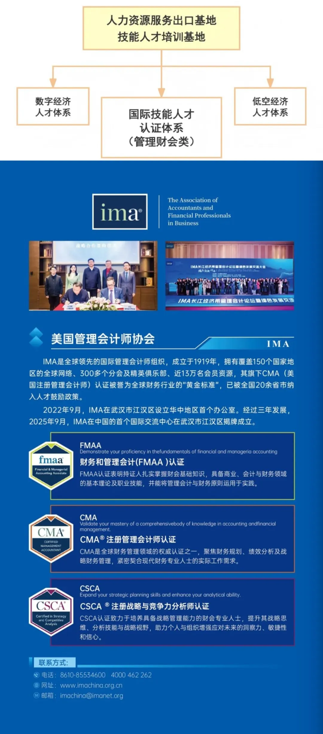 根据共识内容,IMA将参与江汉区技能人才培训基地的课程设计、师资培养、职业评估与认证实施,重点增强人才在数据分析、战略决策、企业内控与可持续发展等领域的核心能力。同时,IMA还将支持基地开展国际化实践项目,推动学员参与全球案例研讨与职业发展活动,构建“学习—认证—实践”的完整闭环。